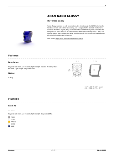 Skulptúra mužskej tváre, ktorá zároveň evokuje vybrúsený diamant - takto možno opísať osobitý rad ADAN, ktorý pre španielsku spoločnosť VONDOM navrhla dizajnérka Teresa Sapey. Modely ADAN majú predstavovať výsledok rovnováhy medzi minulosťou a budúcnosťou. Sú to multifunkčné architektonické kúsky v podobe stoličiek, kvetináčov a odkladacích alebo konferenčných stolíkov. Objekty sa hodia do rôznych prostredí a ich materiály umožňujú použitie v exteriéri aj interiéri. Nábytok ADAN ešte viac oživuje zabudované LED osvetlenie, ktoré je charakteristické pre značku VONDOM.