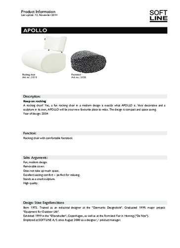 Hledáte kousek, který vašemu interiéru dodá nápad a vtip? Houpací křeslo APOLLO pocházející z hlavy designérky Stine Engelbrechtsen je ideální volbou. Křeslo má příjemně zaoblený tvar a je kompletně čalouněné. Široká nabídka materiálů a barev čalounění včetně možnosti čalounění vlastní látkou poskytuje možnost nakonfigurovat si křeslo přesně tak, aby designově korespondovalo s prostorem, pro který je určeno. Může se tak stát základním designovým prvkem, na kterém postavíte celý interiér, ale stejně snadno jím doplníte další nábytek či již zařízený prostor. Potah je snímatelný. Ke křeslu lze přiobjednat také podnožku. Na vyžádání lze vnitřní výplň čalounění opatřit úpravou pro zvýšení odolnosti proti požáru. Tak vybavte svůj domácí či komerční interiér hravým kouskem, který poskytne pohodlné relaxační posezení a vykouzlí úsměv na tváři.