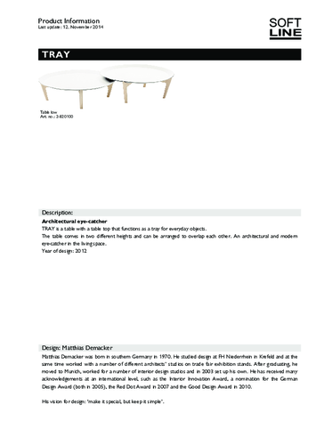 Univerzální praktický stolek Tray může sloužit jako odkládací nebo jako konferenční. Pochází z hlavy designéra Matthiase Demackera a můžete ho použít jako solitér nebo v kombinaci s jeho nižším sourozencem. Podnož je vyrobena z kvalitního mořeného jasanového dřeva v přírodním provedení nebo z černě lakovaného kovu. Laminátová stolová deska je k dispozici v bílém provedení. Tak vybavte svůj interiér praktickým a stylovým pomocníkem!