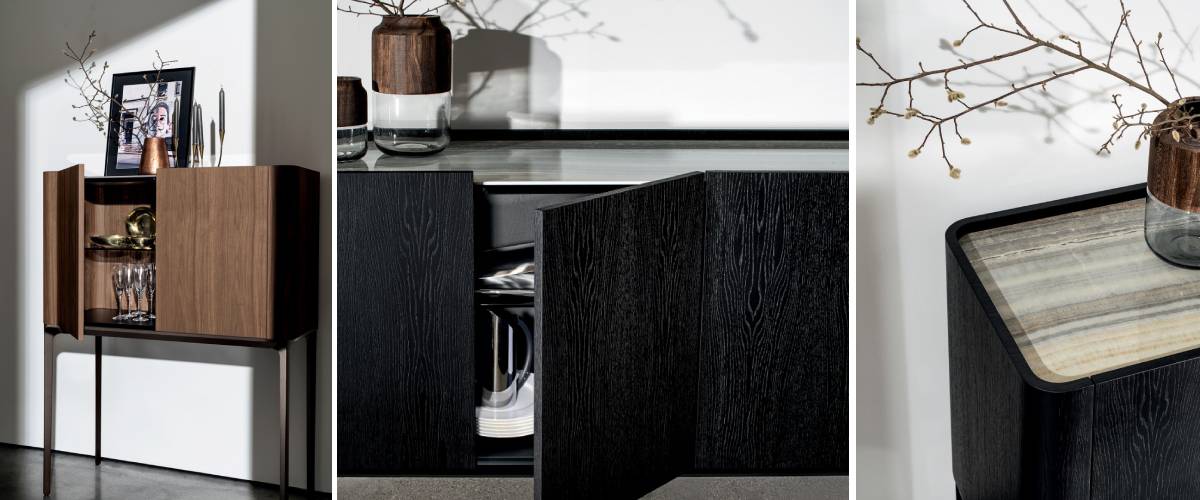 Prvotřídní materiály v luxusním provedení nemusí být křiklavé. V případě Luxusní skříňky MADIA SLIM H74 od italské značky SOVET to platí dvojnásob. Bytelný dřevěný korpus v provedení ořech nebo mořený dub stojí na vysoké čtyřnohé hliníkové podnoži. Tu si můžete vybrat v 5 variantách povrchových úprav. Slutečnou třešinkou na dortu je však vrchní deska, která je na výběr různých odstínech keramiky s bohatou kresbou nebo síťovaného skla. Luxusní skříňka MADIA SLIM H74, která zapadne do každého nadčasového interiéru, je k dostání ve 2 velikostech