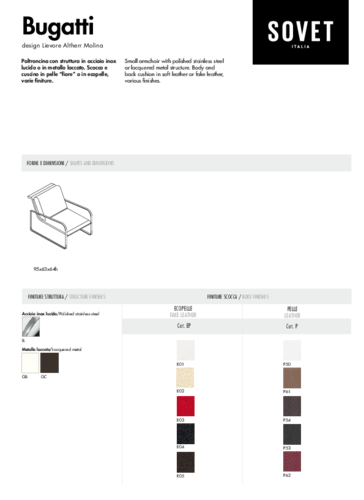 Malé křeslo Bugatti inspirované funkcionalistickým designem z 20. - 30. let minulého století je počinem talentovaného designérského tria Lievore Altherr Molina. Křeslo Bugatti je ideální zejména do moderních prostor v minimalistickém stylu a má všechny předpoklady k tomu, aby se stalo skutečnou hvězdou interiéru. Měkká baculatost polstrovaného polštáře elegantně kontrastuje s jednoduchými liniemi rámu a skořápky. Křeslo je dostupné v různých barvách. Konstrukce křesla se vyrábí z kovu v lakované úpravě nebo z leštěné nerez oceli. Čalounění v kožence nebo v kůži nabízíme v pestré škále provedení, stejně jako podnož křesla.