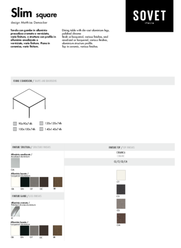 Elegantní minimalistický jídelní stůlSLIM padne díky svému univerzálnímu designu ve tvaru čtverce skvěle do každého interiéru. Stolovou desku můžete mít v několika typech - ve skle či keramice a to v mnoha barevných úpravách. Čtyřnohá podnož je vyrobena z leštěného chromovaného hliníku nebo lakovaného hliníku. Na výběr několik velikostí stolových desek. Stůl, bez kterého si brzy nedovedete představit svůj domov.