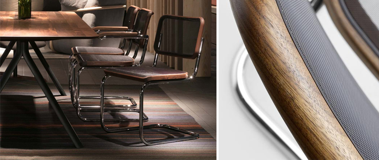 Hledáte klasickou židli s moderními prvky? Jednu bychom tu měli. Nadčasová krása nejznámější židle S 32 N, jejíž první návrhy vznikly v 20. letech minulého století v dílně Marcela Breuera. Díky sofistikované konstruktivní formě, estetické kombinaci ohýbané oceli, dřeva a síťovině lze židli využít jak v kavárnách, čekárnách, restauracích nebo bytových interiérech. Konstrukce židle z ohýbané pochromované nebo lakované oceli. Sedák a opěrák tvořený syntetickou síťovinou v černé barvě, který je natažený na bukový rám v lakovaném provedení.