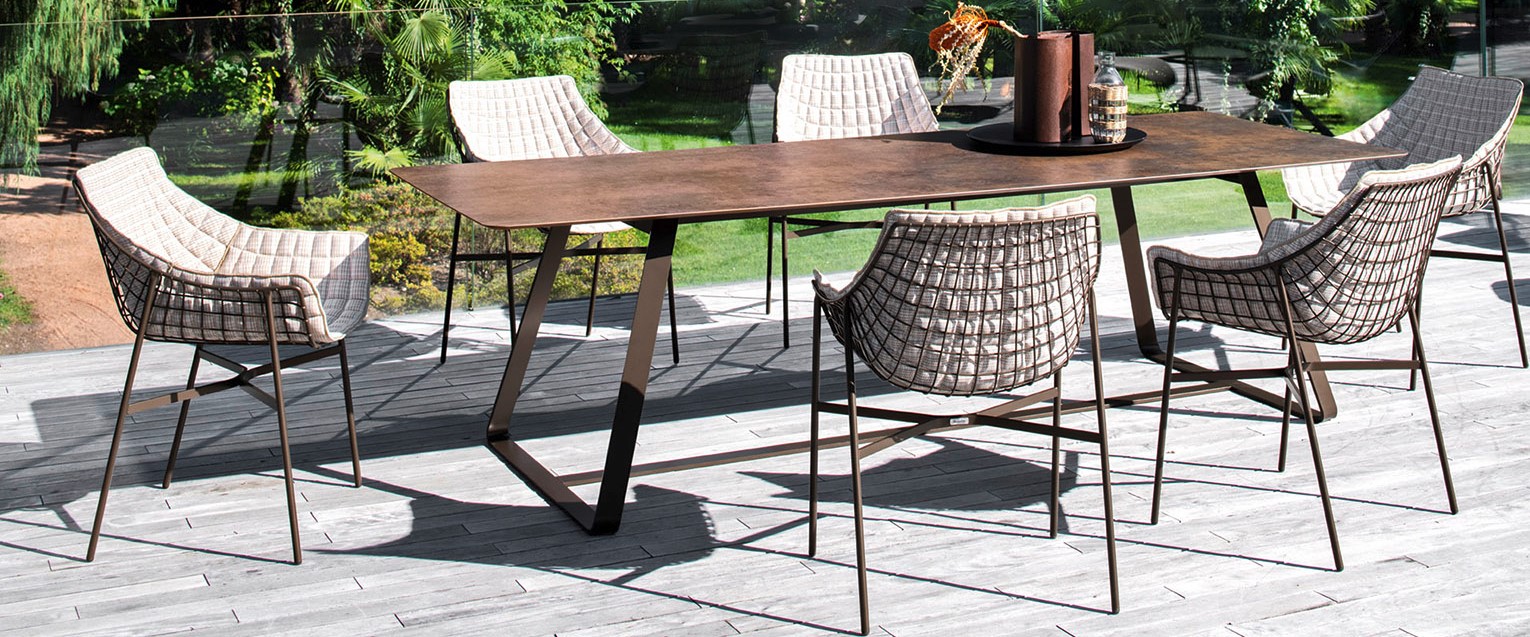 Židle, křesla, houpací křesla a konferenční stolky: kolekce SUMMER SET nabízí čistotu stylu inspirovanou prvky avantgardního designu v různých druzích venkovního nábytku. Jádrem kolekce je síťová struktura, obratné propletení kovového drátu dostupného v několika barvách. Kolekce kombinuje moderní eleganci a absolutní pohodlí.
