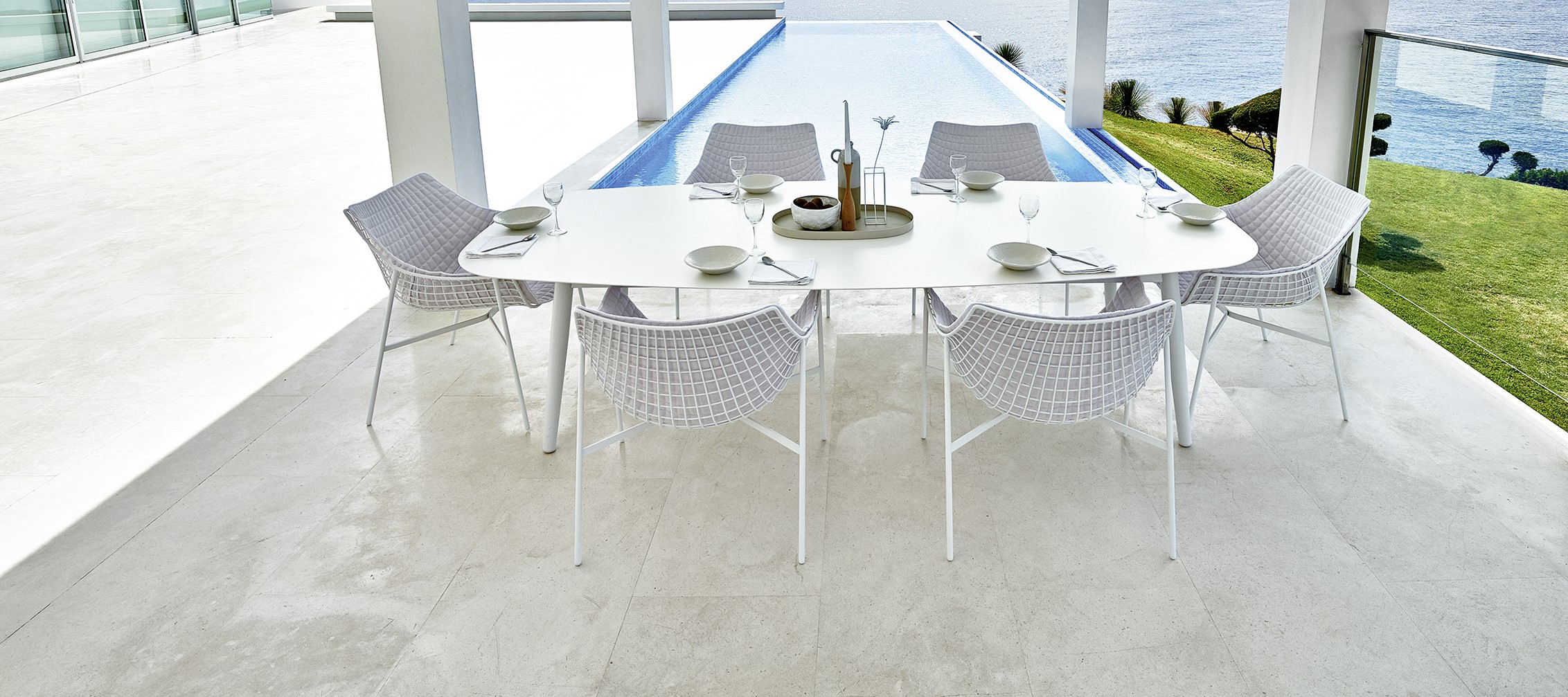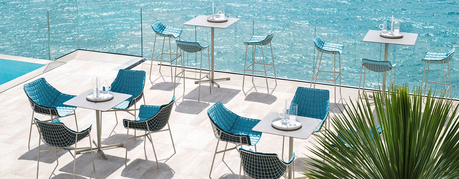 Židle, křesla, houpací křesla a konferenční stolky: kolekce SUMMER SET nabízí čistotu stylu inspirovanou prvky avantgardního designu v různých druzích venkovního nábytku. Jádrem kolekce je síťová struktura, obratné propletení kovového drátu dostupného v několika barvách. Kolekce kombinuje moderní eleganci a absolutní pohodlí.