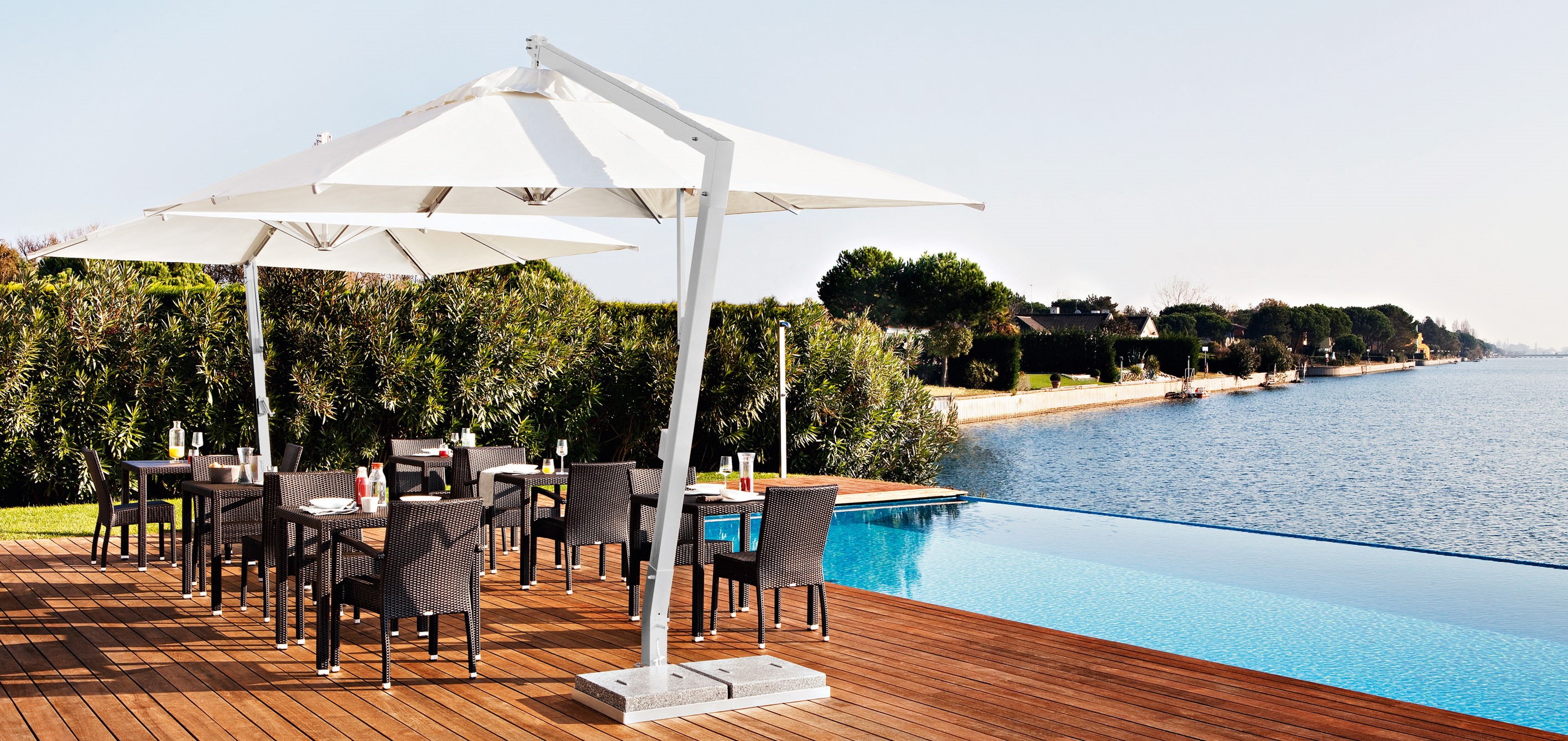Elegantní a dynamický - slunečník Copacabana nabízí příjemný a osvěžující úkryt před sluncem. Robustní konstrukce z hliníku a nerezové oceli nachází stabilitu díky dvěma závažím umístěným na základně. Slunečník Copacabana skvěle doprovází chvíle odpočinku na zahradě, na pláži, u jezera nebo u bazénu. Polyesterová látka odolává vlivům špatného počasí i UV záření.