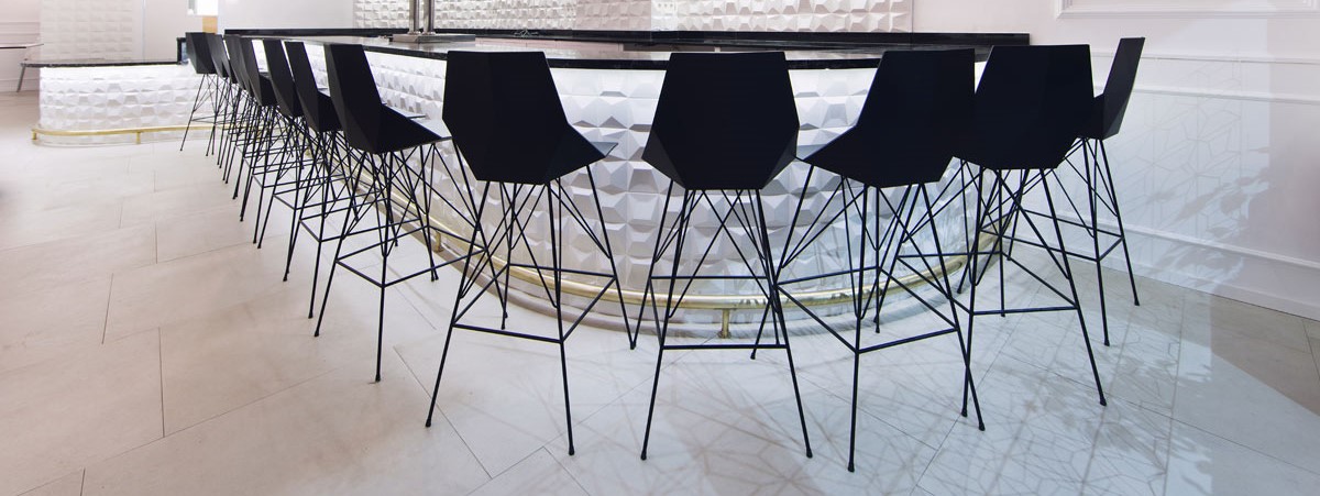 Unikátní barová židle FAZ s područkami inspirovaná přirozenými tvary krystalů je vyrobená z recyklovatelného polyetylenu. Díky lehkosti tohoto materiálu se s židlí snadno manipuluje a je nenáročná na údržbu. Model je k dostání v mnoha barevných variantách - od matného po lakovaný finiš. Pro celistvý vzhled kombinujte spolu s barovým stolem FAZ.