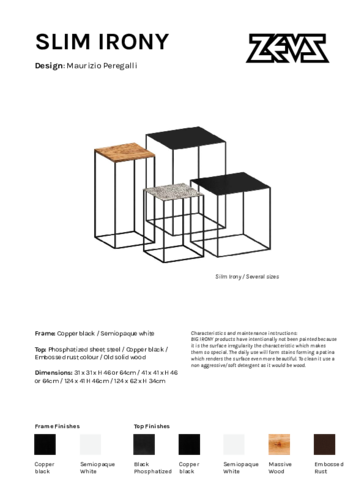 Konferenční stůl SLIM IRONY od italské značky ZEUS oslní všechny vyznavače minimalistického designu. Vyrobený je z kovu a vybrat si jej můžete ve 4 barvách. Tenkou stolovou desku podpírá superštíhlá podnož která v dolní části kopíruje obrysy desky. Tento model má rozměry 124 x 41 cm, v nabídce máme také vyšší model. Variabilní kus nábytku, který využijete v obývacím pokoji nebo různých společenských místnostech, kde si rádi posedíte u šálku kávy. Čistý styl bez zbytečných příkras. Elegantní jistota, na kterou se můžete spolehnout každý den!
